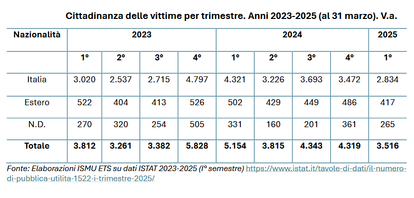 La violenza di genere nel nostro Paese continua a essere una grave emergenza sociale e ha un impatto ancora più marcato sulle donne con cittadinanza non italiana. Dall’analisi dei dati Istat relativi al numero antiviolenza e stalking 1522 emerge che, tra il 2023 e il primo semestre del 2025, hanno contattato il servizio 30.615 donne italiane e 4.148 donne con cittadinanza non italiana. In rapporto alla popolazione residente, si rileva un’incidenza dello 0,10 per cento per le italiane e dello 0,16 per cento per le donne con cittadinanza non italiana, con una probabilità superiore del 60 per cento per queste ultime di rivolgersi al servizio, senza considerare tutte coloro che non vi accedono per ragioni diverse-, a conferma di una maggiore vulnerabilità legata a condizioni di precarietà sociale, economica e giuridica. Lo evidenzia la Fondazione Ismu in occasione della Giornata internazionale per l’eliminazione della violenza contro le donne.